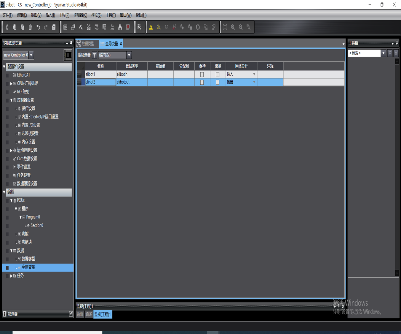 点击【图视】-【监视窗口】开启监控窗口,【名称】选项输入建立的全局变量,可在线监控子 变量的状态