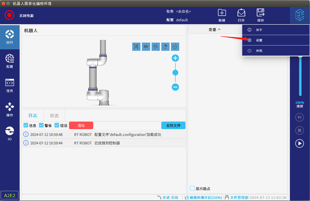 2. 打开机器人软件后,点击右上角kaiyun开云中国log点击设置。