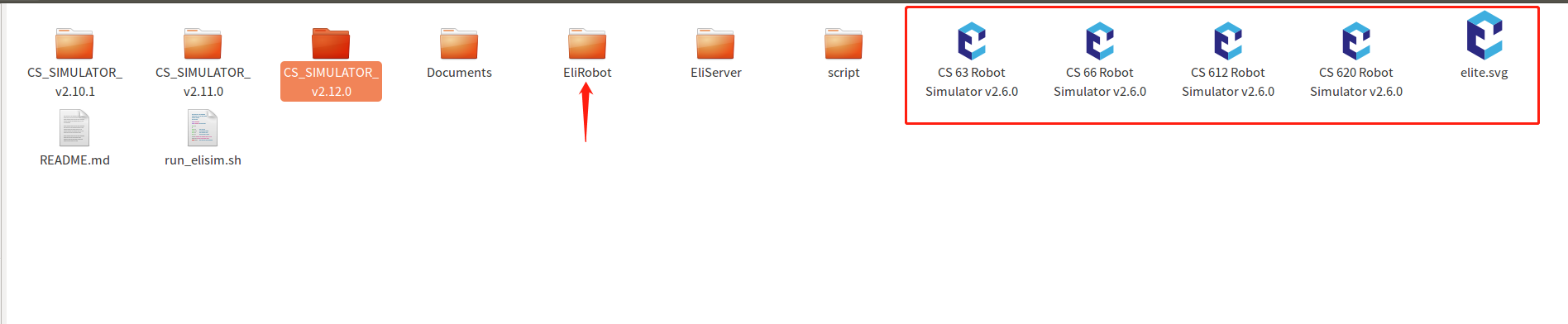 1. 退回到 SIMULATOR 目录下( elisim-CS_SIMULATOR_V2.12.0-SIMULATOR)右击鼠标,选择在终端打开。输入 ./run_elisim.sh或者点击Tab键补全,点击回车,打开机器人软件。
