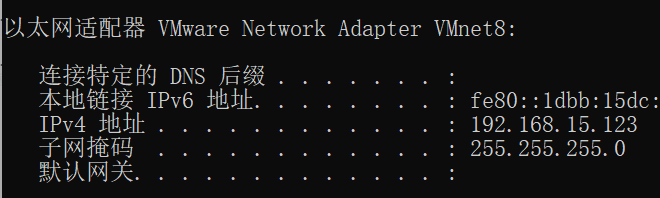 2.  本机操作:cmd 窗口输入 ipconfig ,找到虚拟机软件的 IP:192.168.15.123 。