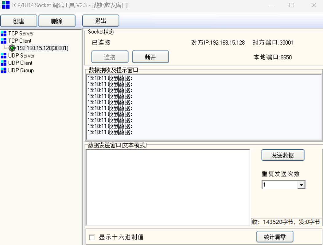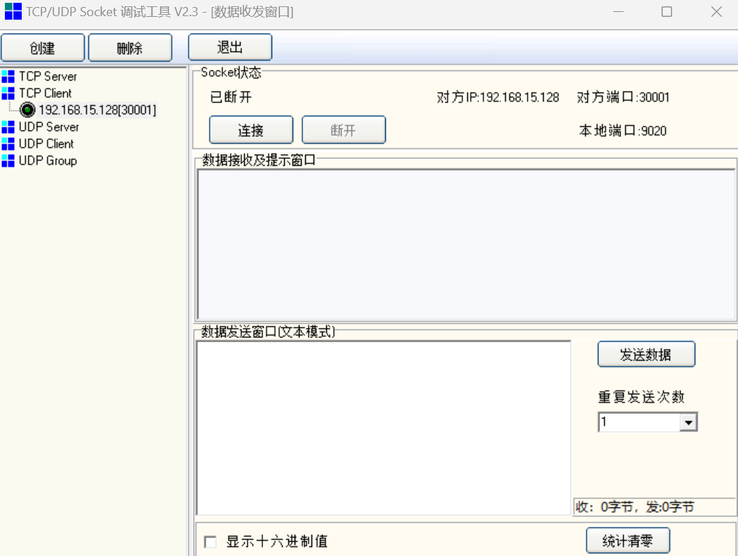 1.本机做主站,机器人做从站。在 SocketTool 软件里,创建客户端,输入在 2.2 里获取的IP:192.168.15.128 ,端口号参考用户手册里的二次开发端口。