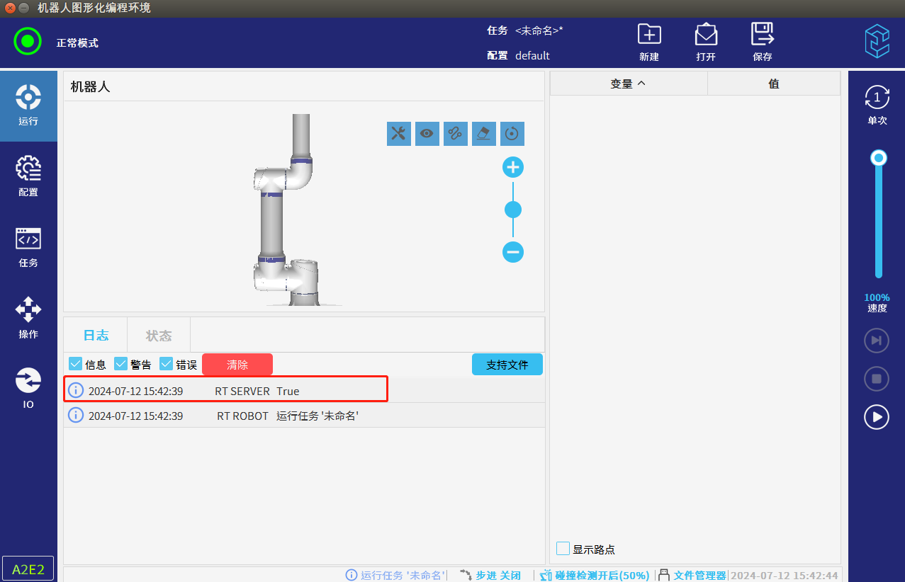 4. 机器人运行程序,连接成功,机器人会在运行窗口,打印 True 。