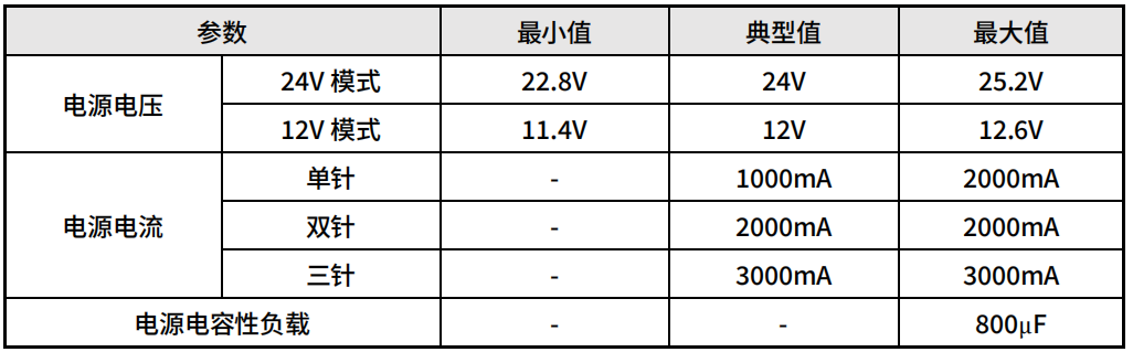 2、双针电源模式下最大电流是2000mA,最大持续时间1 秒,且最大占空比是10%。平均电流不得超过 1000mA。