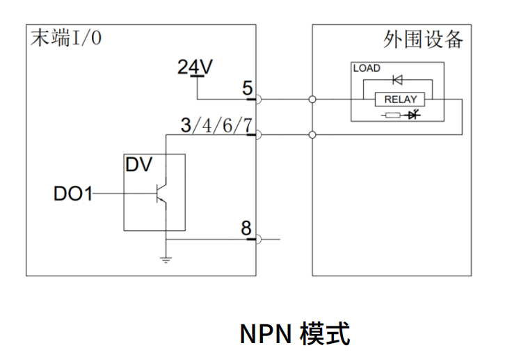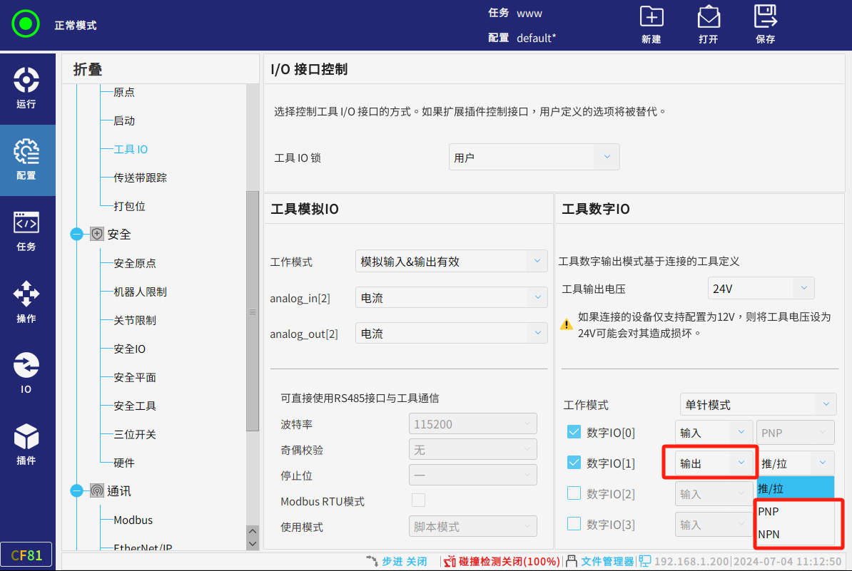 数字IO输出可在工具IO配置PNP或NPN模式