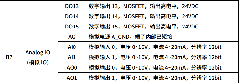 模拟 IO 接口可用于接收/发送模拟量信号(电压(0V~10V)或电流(4mA~20mA))。