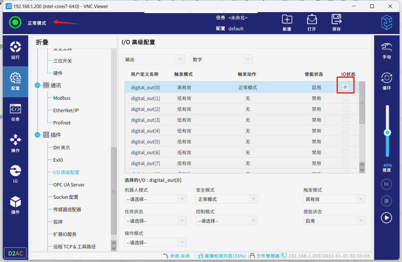● 设置完成后可发现机器人处于正常模式时,对应的DO0已触发。