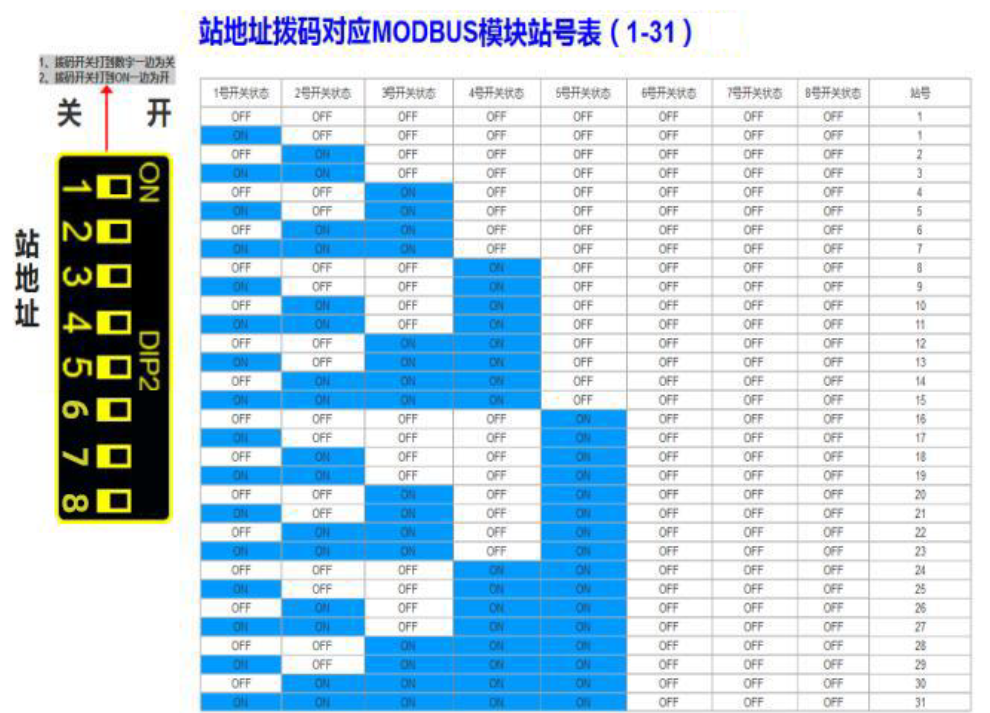 ● 修改站号的范围在 1~32,必须通过调整模块上“站地址”拨码开关的状态设置,注意当模块上电时调整拨码状态时,需将模块断电至少 3S,再上电方可生效。具体对应关系如下表中所示(出厂时所 有拨码为 OFF)。