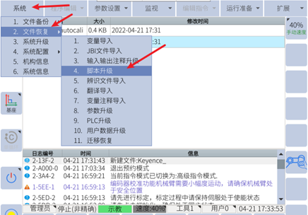 ● 存放好LUA脚本文件后插入机器人的电控柜USB口点击系统->文件恢复(U盘到本地)->脚本升级。