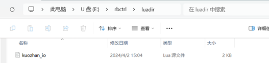 IO模块所使用的脚本程序可查看随同文档一起的“kuozhan_io.lua”程序或者咨询ELITE技术人员;准备一个U盘,在U盘根目录下新建rbctrl文件夹,并在该文件下新建luadir文件夹,将配套的脚本(.lua格式)放到luadir文件夹下,并将U盘插至控制柜U盘口。