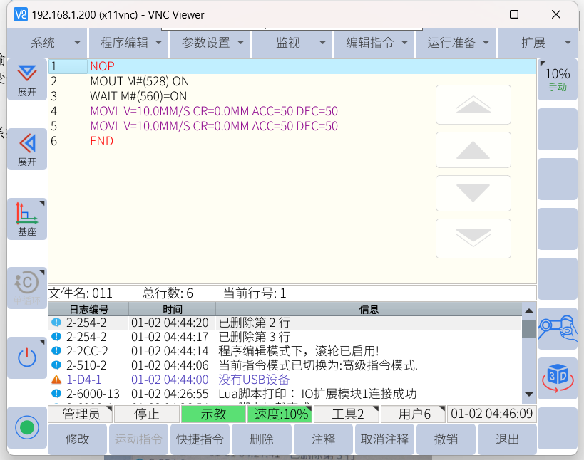 做完上述操作后就已经把 IO 模块的输入输出信号映射到机器人虚拟输出M变量内,以下就可以用机器人虚拟输出M变量控制IO模块的输入输出: