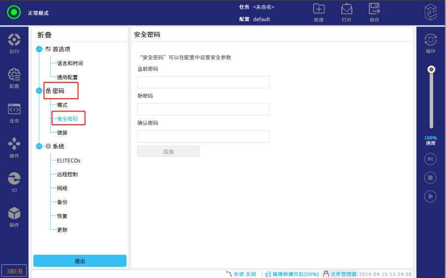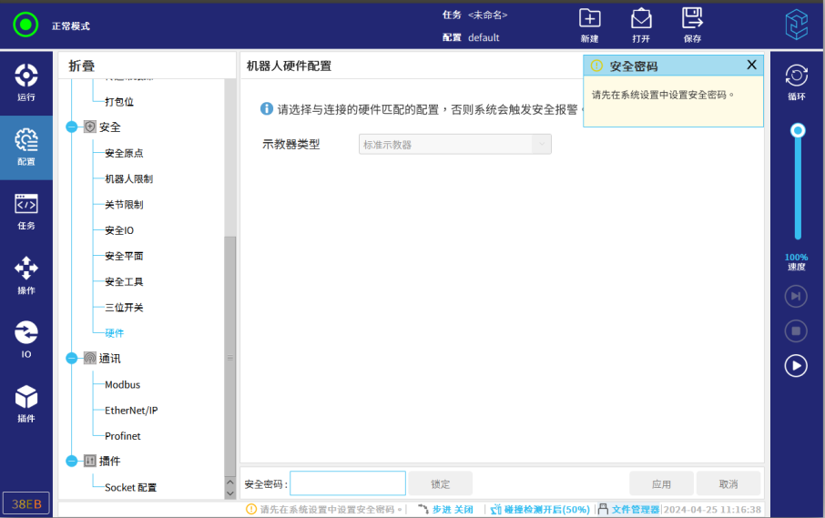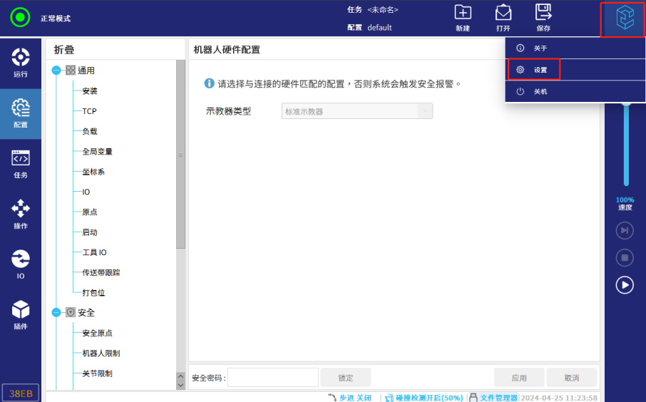 2.7. 在下方输入安全密码后,选择示教器类型。(新机器人需要在设置中,先设置安全密码。没设置安全密码,点击密码框,会提示请在系统设置中设置安全密码。如果没有该提醒,可以直接输入密码,请询问现场人员,设置的安全密码)