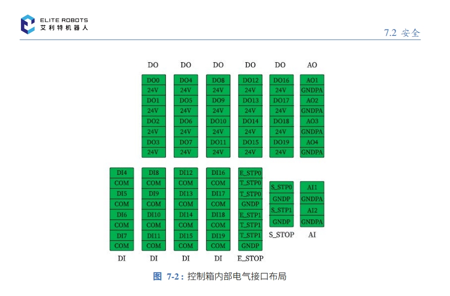 EC机器人控制柜提供了丰富的IO接口,其中包括16路数字输入接口,20路数字输出接口(出厂时默认均为NPN类型,输入可进行NPN与PNP类型切换,输出不可配置),4 路模拟输出,2路模拟输入(-10V~10V),急停接口与防护停止接口各两组。(机器人内部自带24V电源,端子上所有24V内部已短接,所有COM已短接)