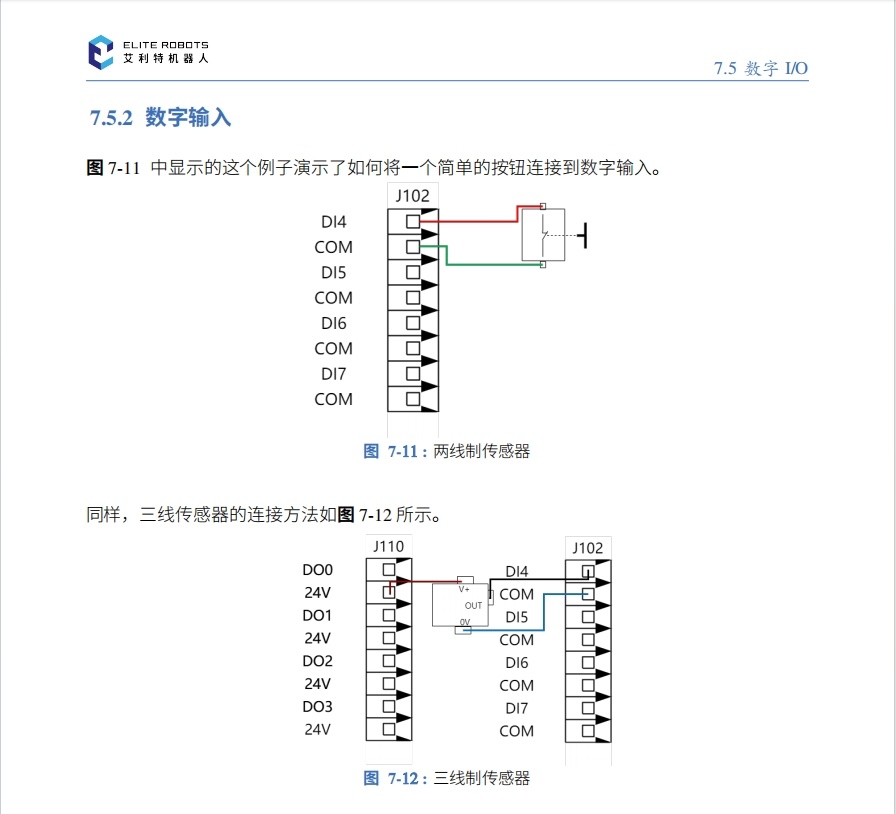 DI口为24V,COM口为0V;所以需要给DI口输入0V,机器人得到信号。简单理解DI口与COM口是一个常开型开关,短接到一起即可得到信号。