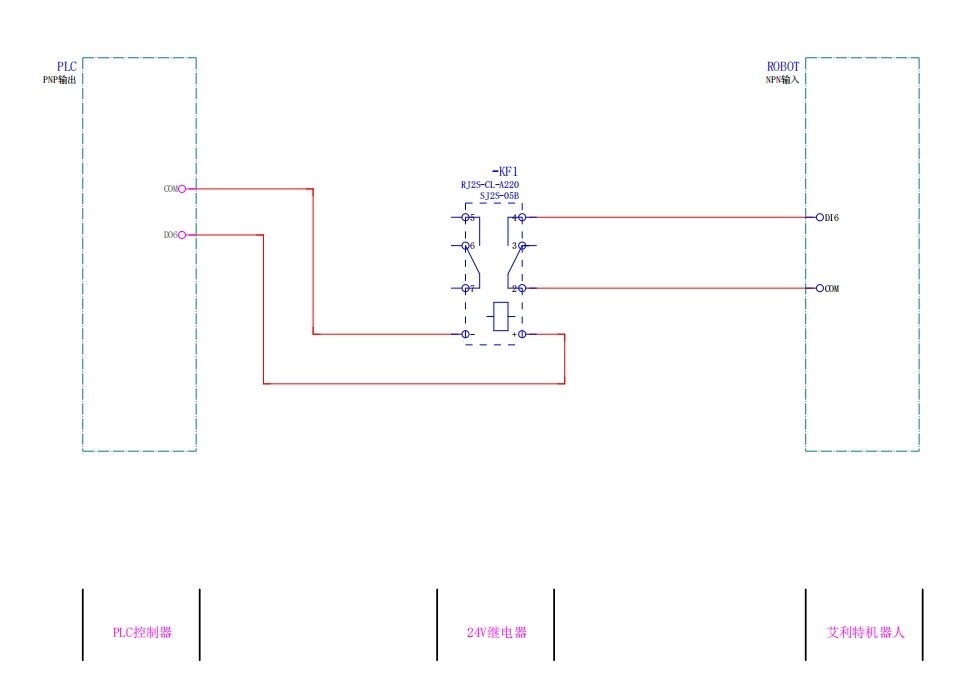 在实际使用过程中可能会遇到各种传感器与PLC,PNP与NPN的都有,这种情况可以通过中间继电器进行信号转换,具体方法为将机器人的输出信号接在继电器的线圈端,负载接在继电器的触点端,当机器人输出信号时,线圈得电,触点吸合,负载得电。(输入接法则相反,下图为输入接法)
