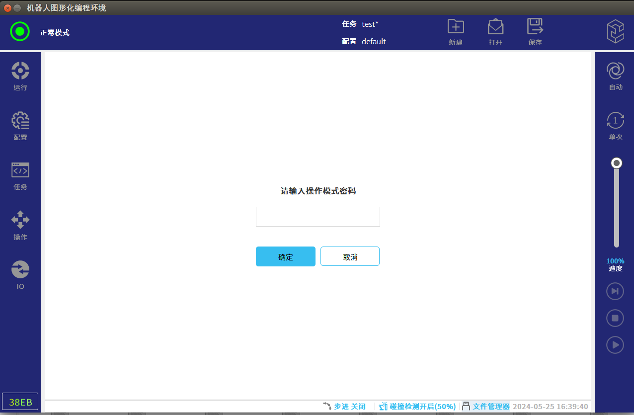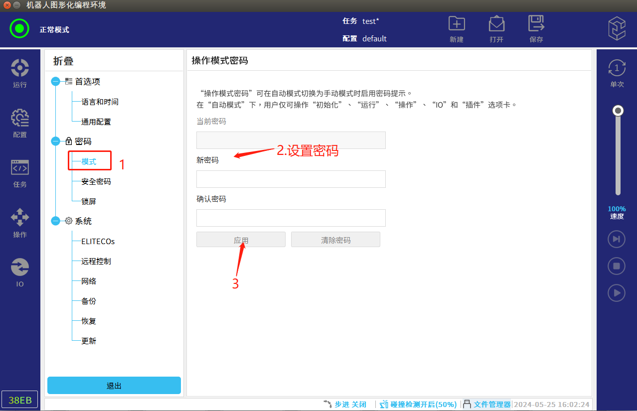 在手自动模式切换中,从自动模式切换成手动模式需要输入之前设置好的密码,所以密码一定要记住,如果忘记了可以联系ELITE机器人售后进行清除重新设置