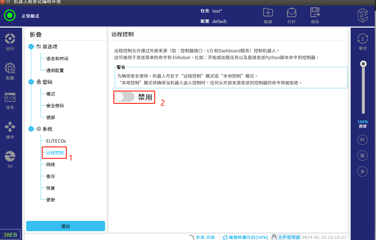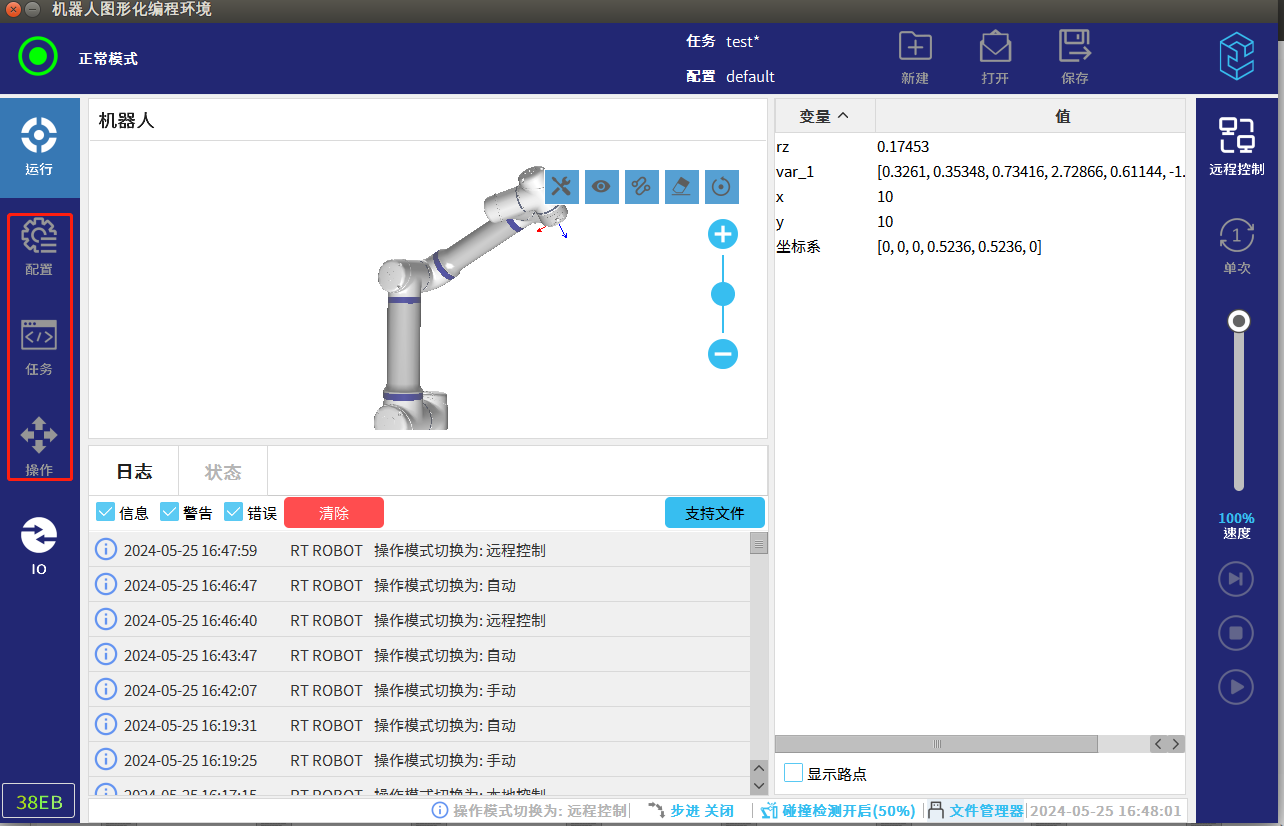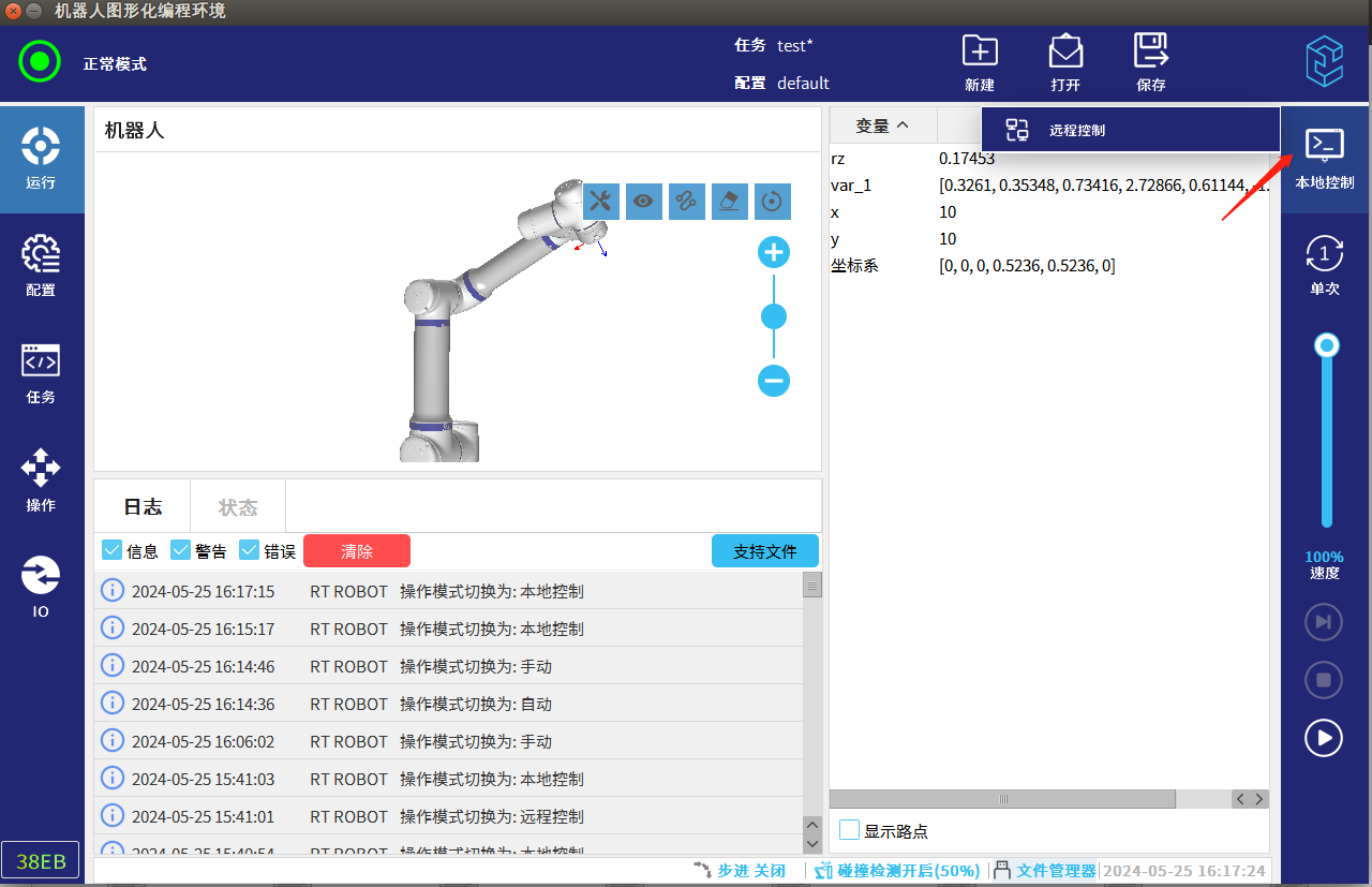 远程模式即为可以通过远程控制器来控制机器人的运动,例如通过Modbus,Ethernet,Profinet等通讯远程控制实现机器人的运行