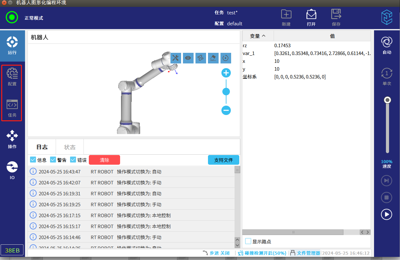 在切换成自动模式时,出于安全考虑是无法查看及修改机器人的程序以及配置状态的,如需修改则需要重新切换成手动模式
