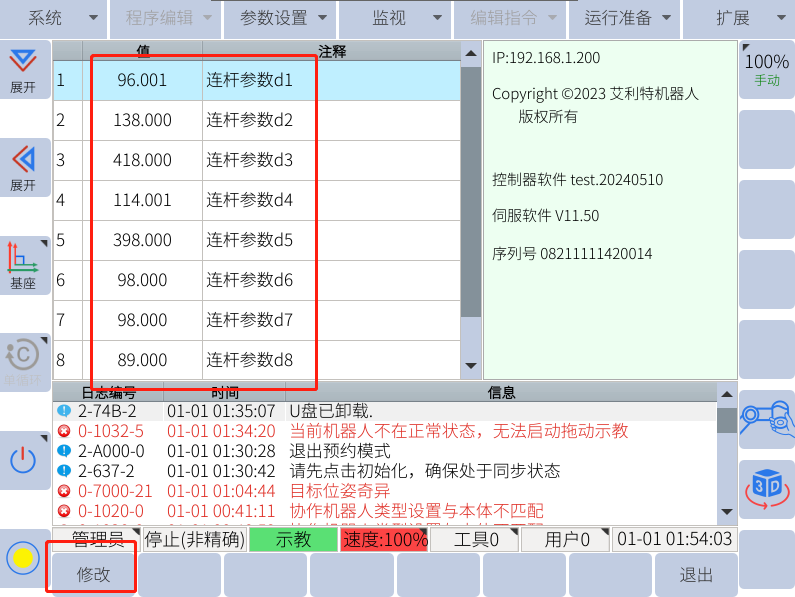 ②手动查看原机器人dh记录恢复后更改:参数设置--机械臂DH,点击左下角可修改,断电重启保存