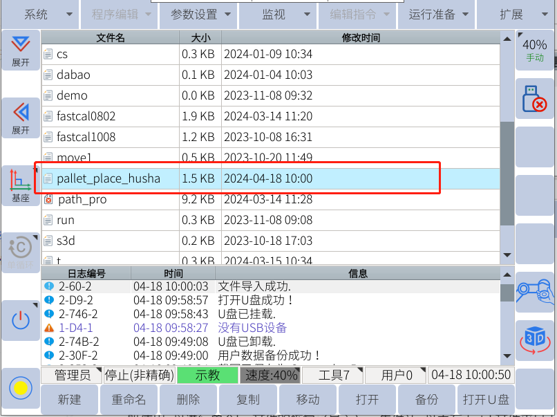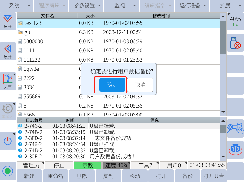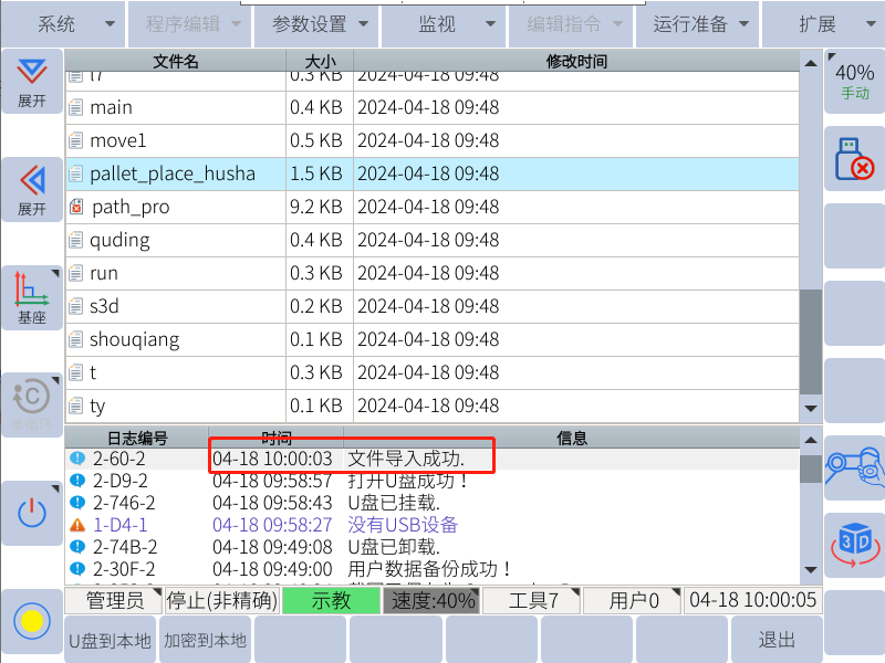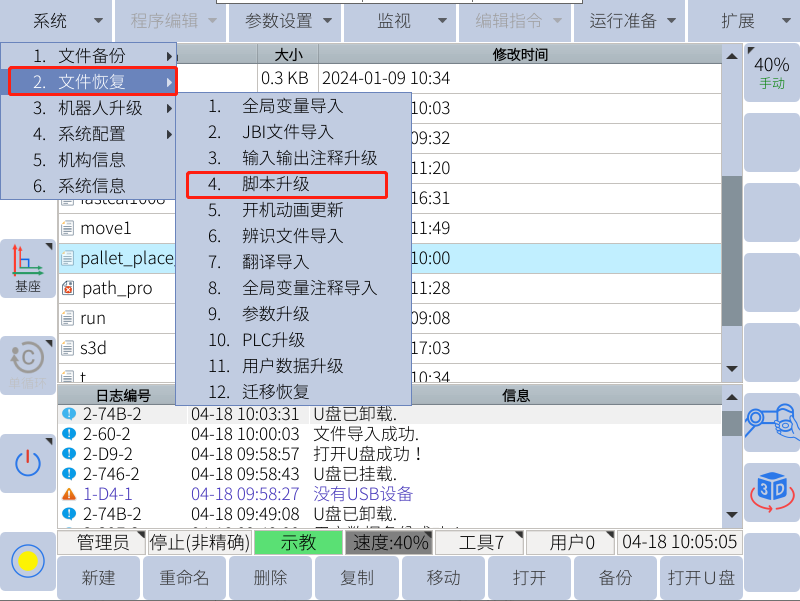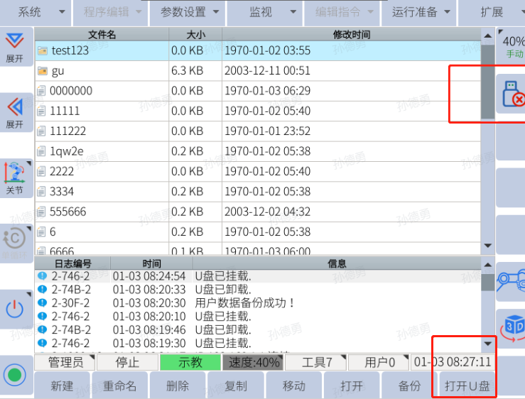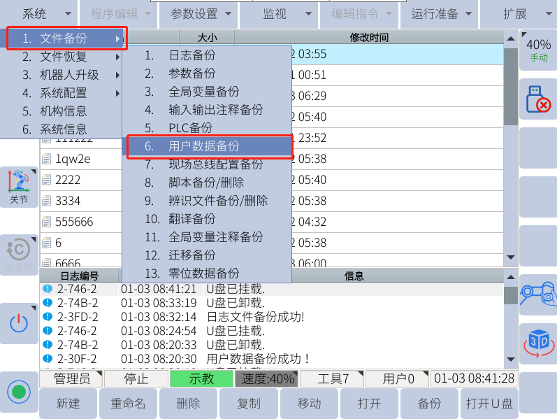 注:只有示教器上显示u盘图标的时候才能用来备份和恢复(导入导出相关数据)