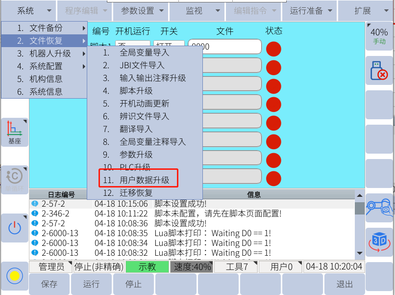 用户数据恢复可恢复出所有jbi和lua文件,也包括用户plc,全局变量及注释等;一般复制一台机器人应用的程序到另一台机器人的时候,可以使用用户数据恢复(不包含全局变量);