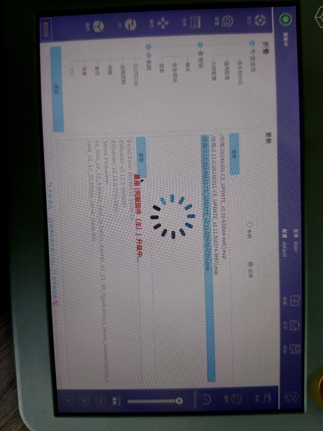 调试阶段建议全部勾选进行升级,也可单独勾选应用升级(应用:系统版本,一般是解决应用软件的bug和界面优化;MCU: 指伺服升级;驱动IO:指末端IO的升级)。点击“是”,会自动进行更新系统;请勿操作机器人或将其断电。等待更新后重启。