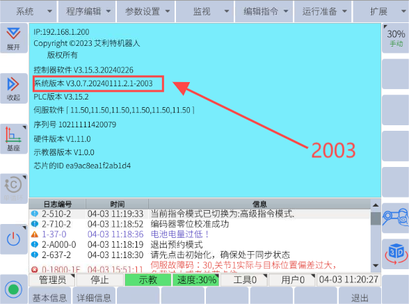 网页版示教器适用的控制柜主板版本为“-2003”款的版本,如果是“-1000”款的版本,是无法连接网页版示教器的。查看方式:系统-----系统信息-----详细信息-----系统版本号后缀。如图: