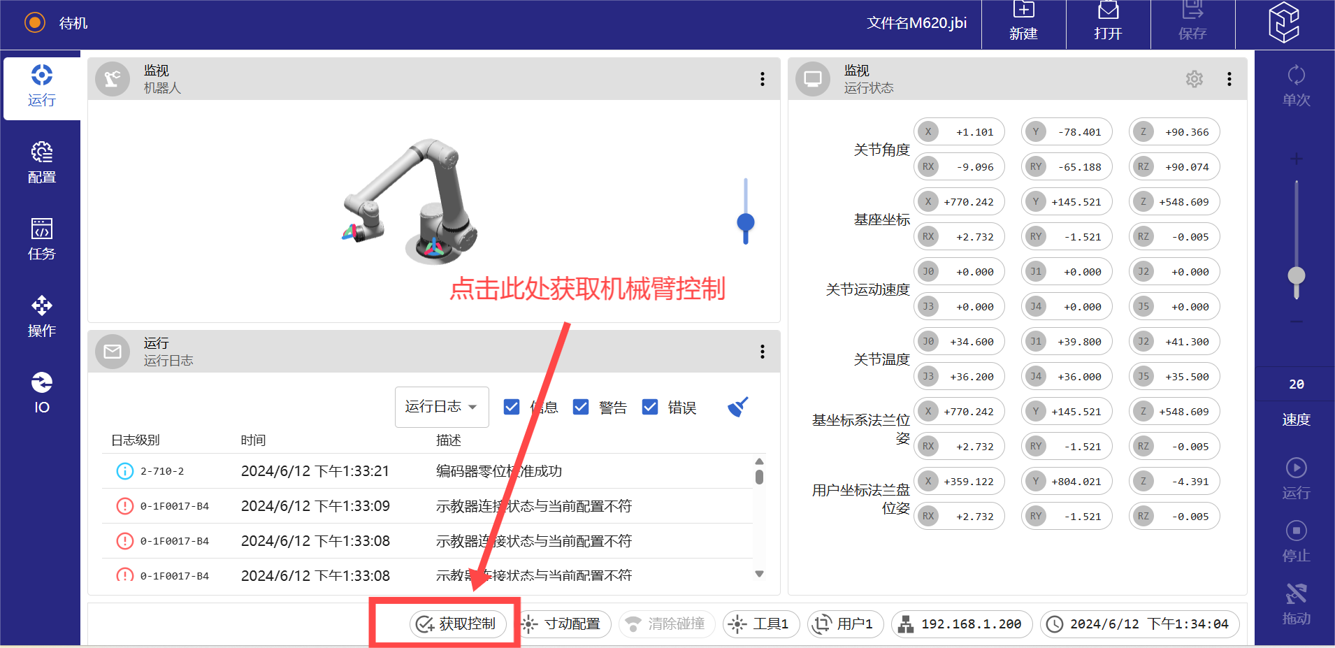 (6)进入操作界面后先点击下方菜单栏里面的“获取控制”,等获取控制按键从白色变为绿色,即可获取机械臂的操作权。