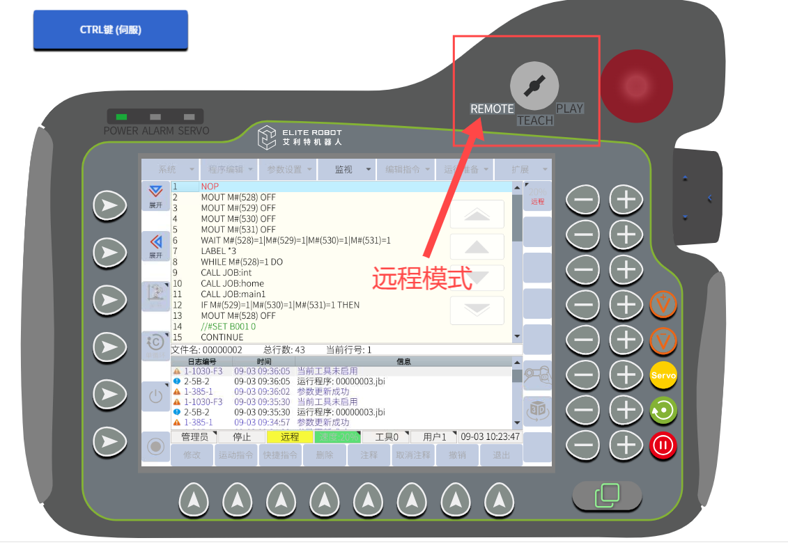 示教器右上角的钥匙应该切换置远程模式即可。